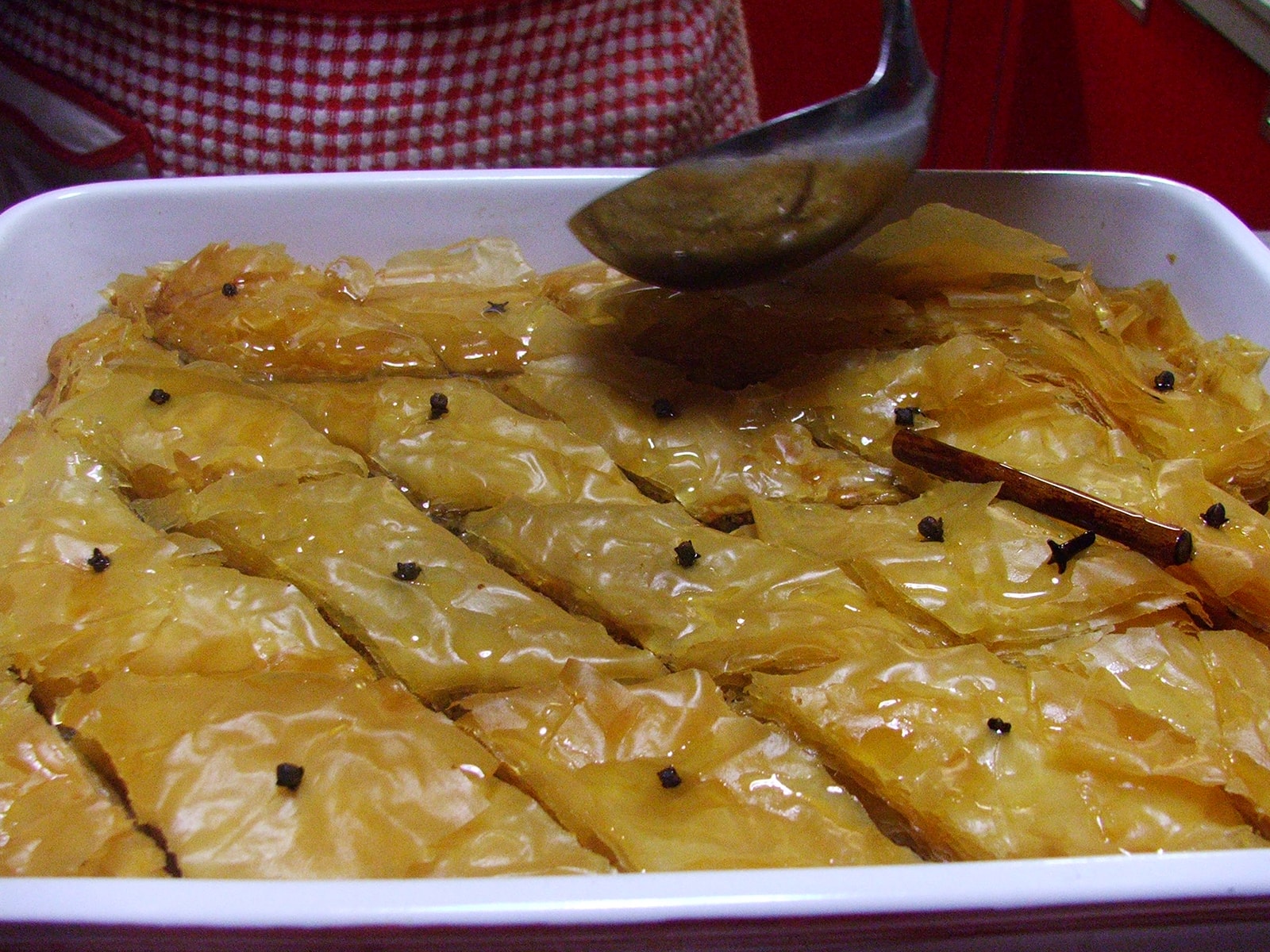 - Appena sfornato sciroppiamo il baklavas con l’aiuto di un mestolo su tutta la superficie. Lasciamo almeno una notte assorbire bene e assaggiamo il giorno successivo. Buon natale a tutti!