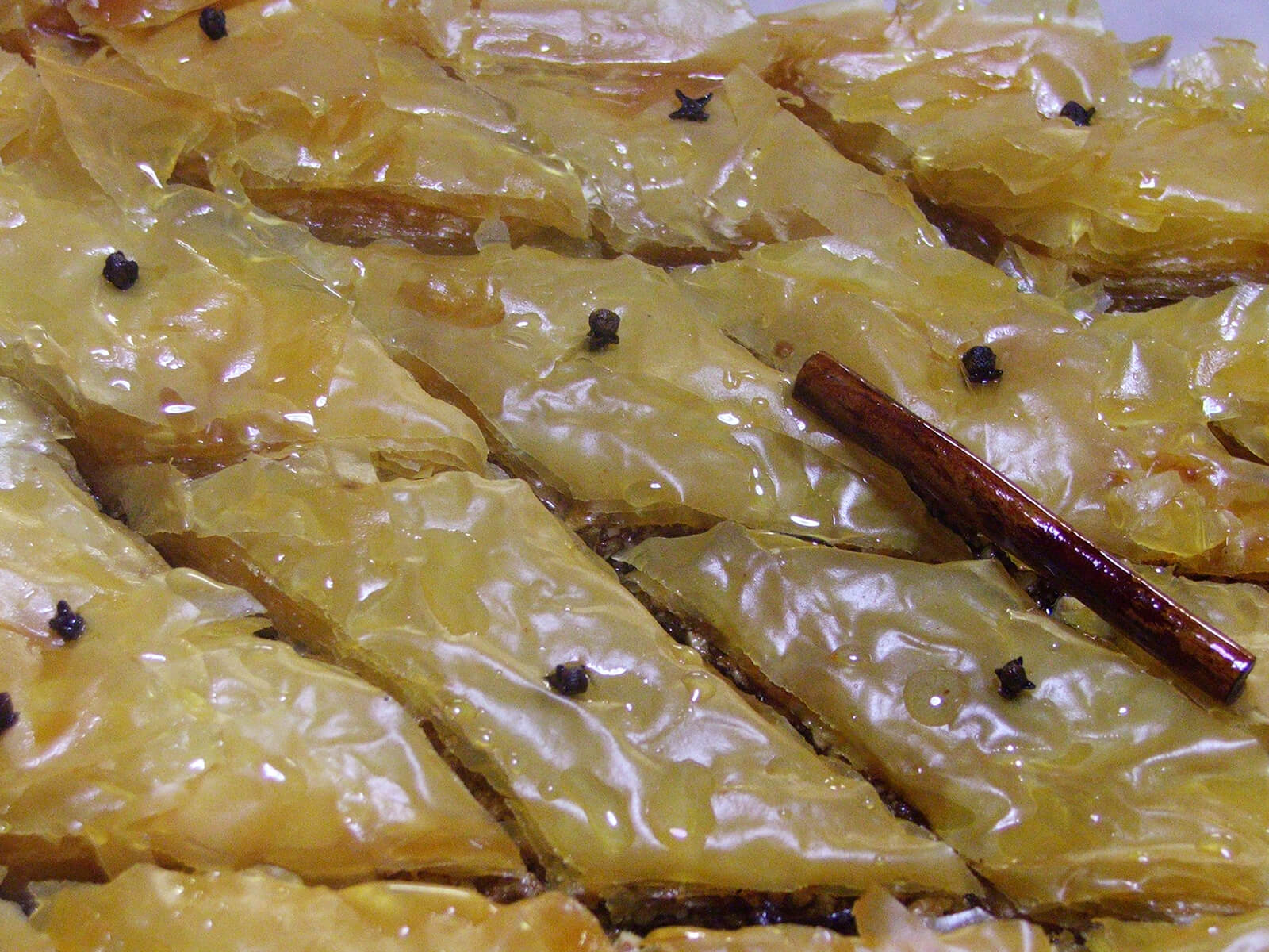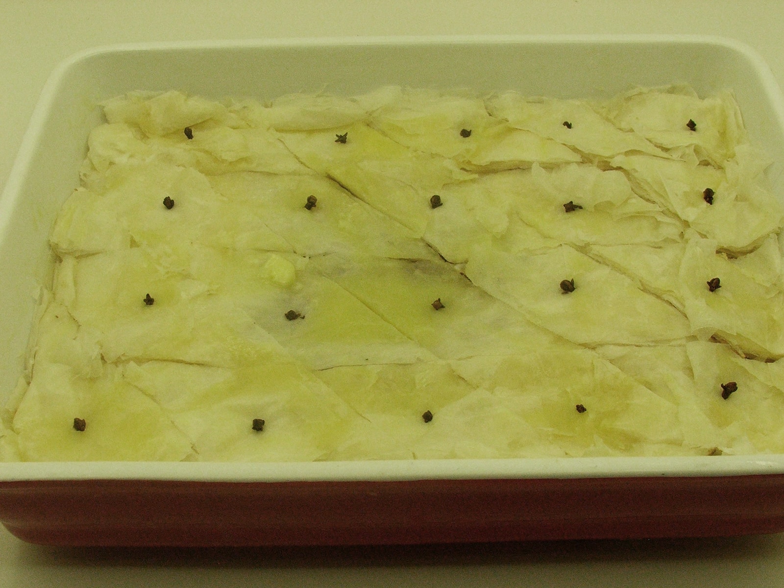 - A questo punto lo dobbiamo incidere, ma visto che con il burro sciolto rischiamo di rovinare il baklavas, lo mettiamo per mezz’ora dentro il frigorifero. Adesso con il burro freddo tagliamo il nostro baklavas a piccoli pezzi a forma di rombo e mettiamo al centro di ogni rombo un chiodo di garofano.