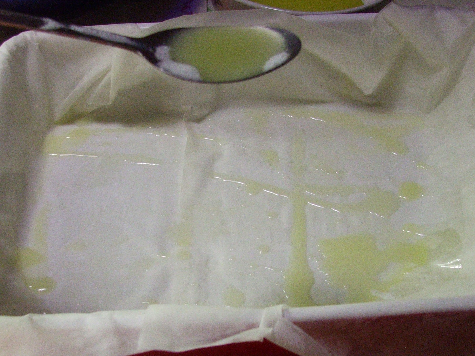 - Prepariamo la base del baklavas appoggiando 1 foglio di pasta fillo in fondo della teglia, lasciando uscire fuori dai bordi il resto del foglio. Con l’aiuto di un cucchiaio o di un pennello imburriamo abbondantemente la superficie della pasta ed anche le parti che fuoriescono dalla teglia. Se non stiamo attenti a questo passaggio probabilmente avremo un baklavas secco e poco saporito. In tutto mettiamo 3 fogli in questo modo.
