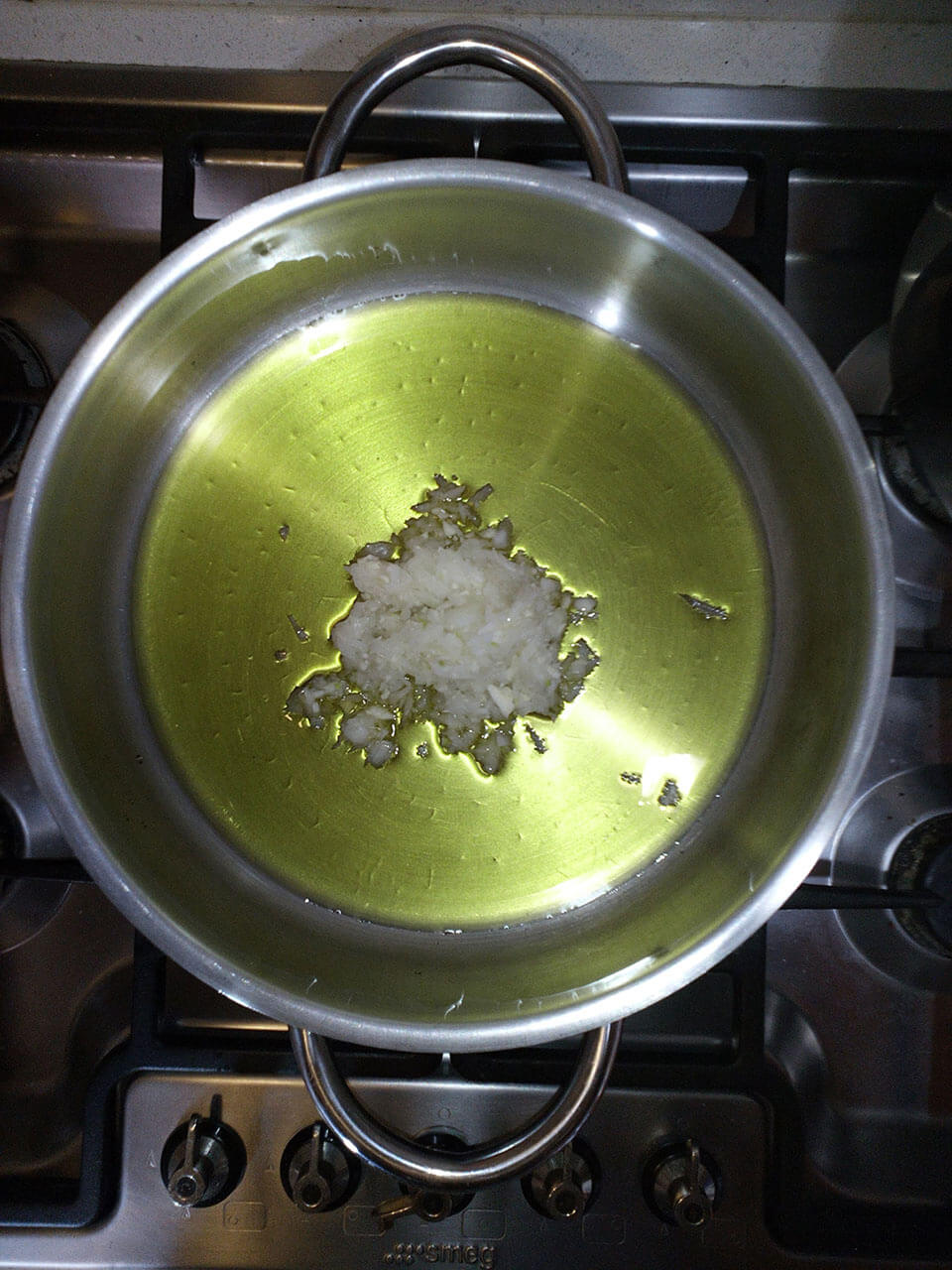 - In una pentola larga e bassa mettiamo l’olio insieme alla cipolla e l’aglio e soffriggiamo per 2 minuti. Prestate attenzione a non bruciare la cipolla.