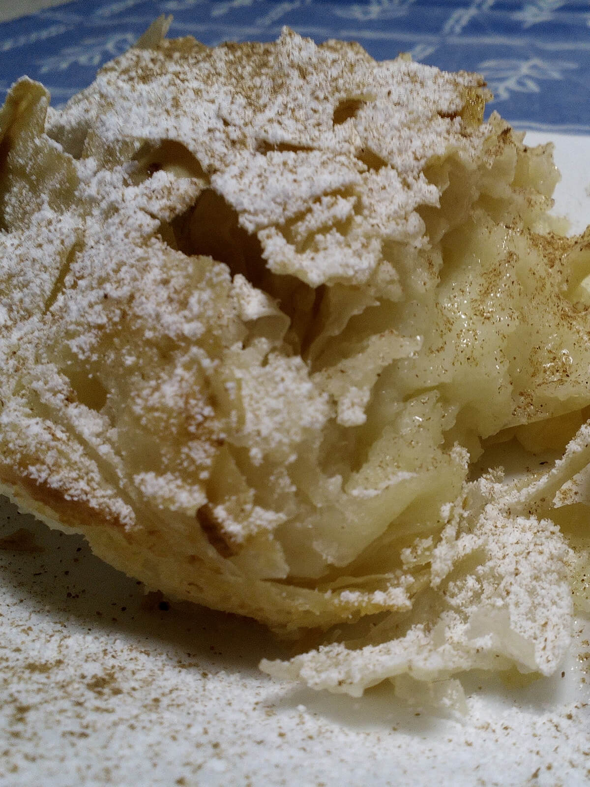 - A fine cottura deve risultare friabile e dorata. Serviamo la nostra bougatsa calda e spolveriamola con abbondante zucchero a velo e cannella.
