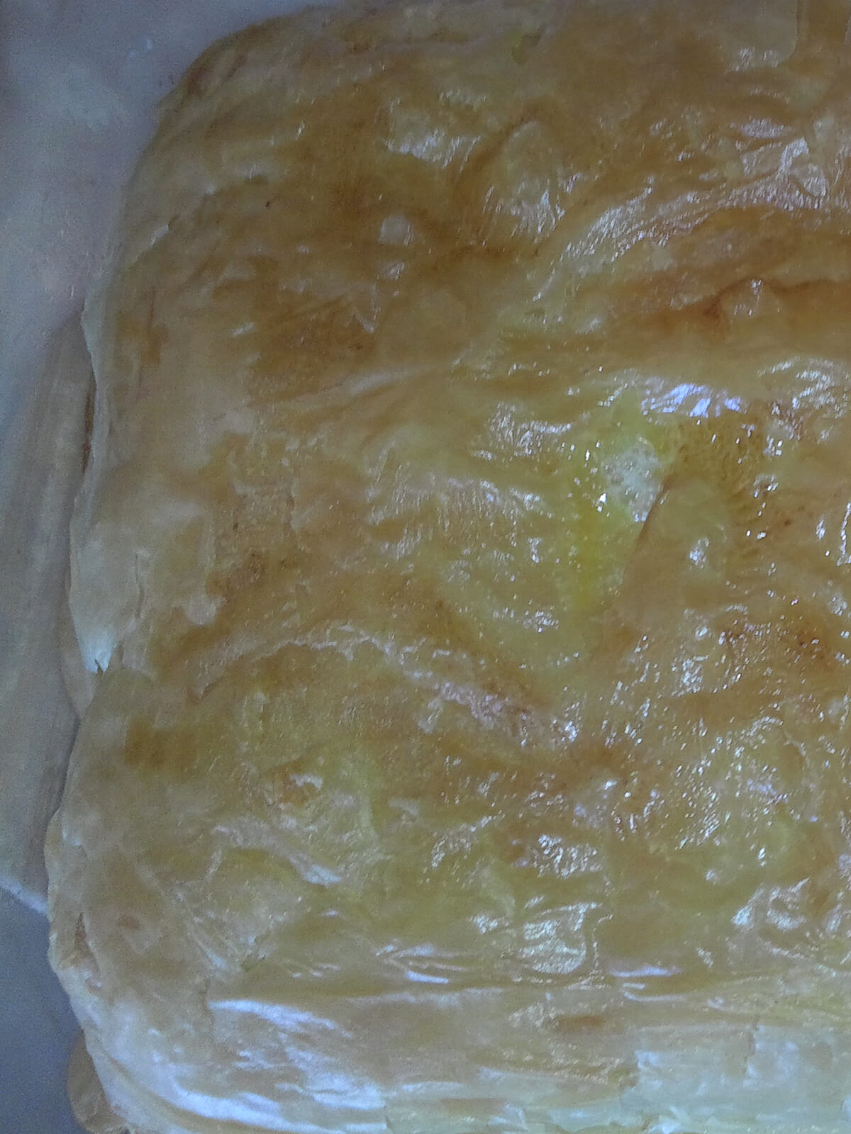 - Quando abbiamo “chiuso” la bougatsa, imburriamo uniformemente la superficie e inforniamo a forno ventilato a 180º per circa 40 minuti.