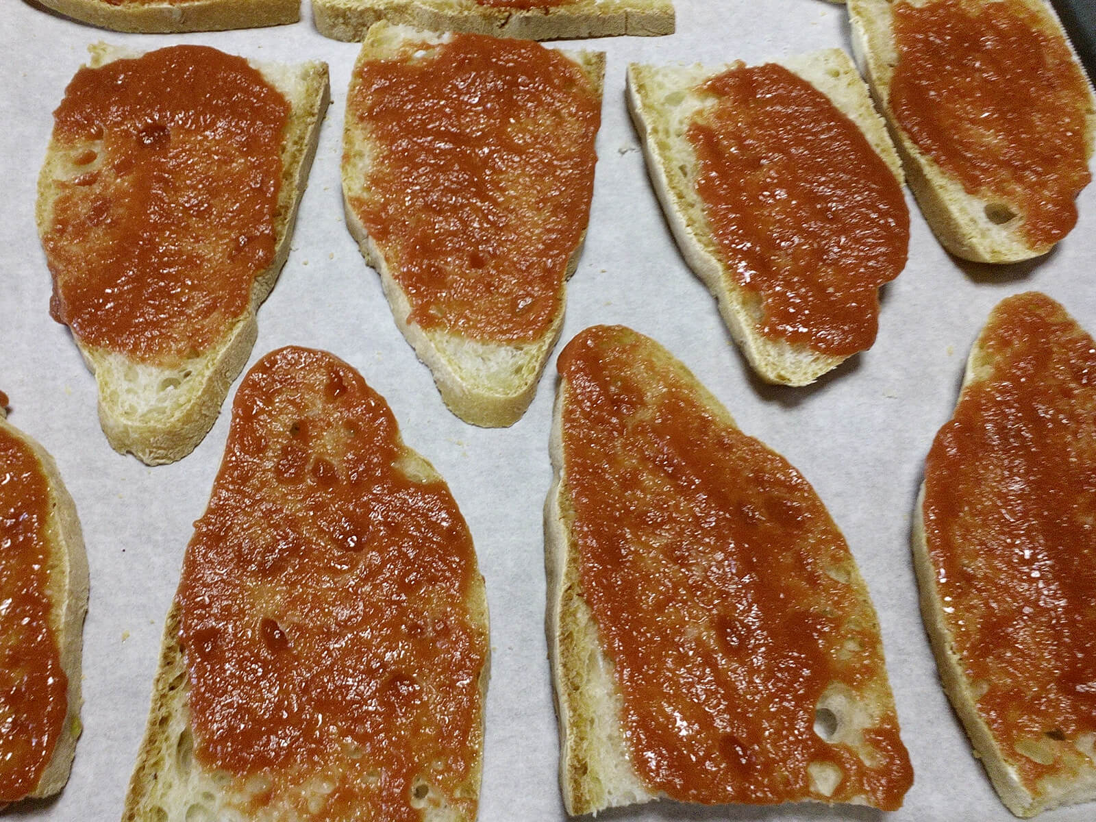 - Spalmiamo bene con il pomodoro le fette di pane.