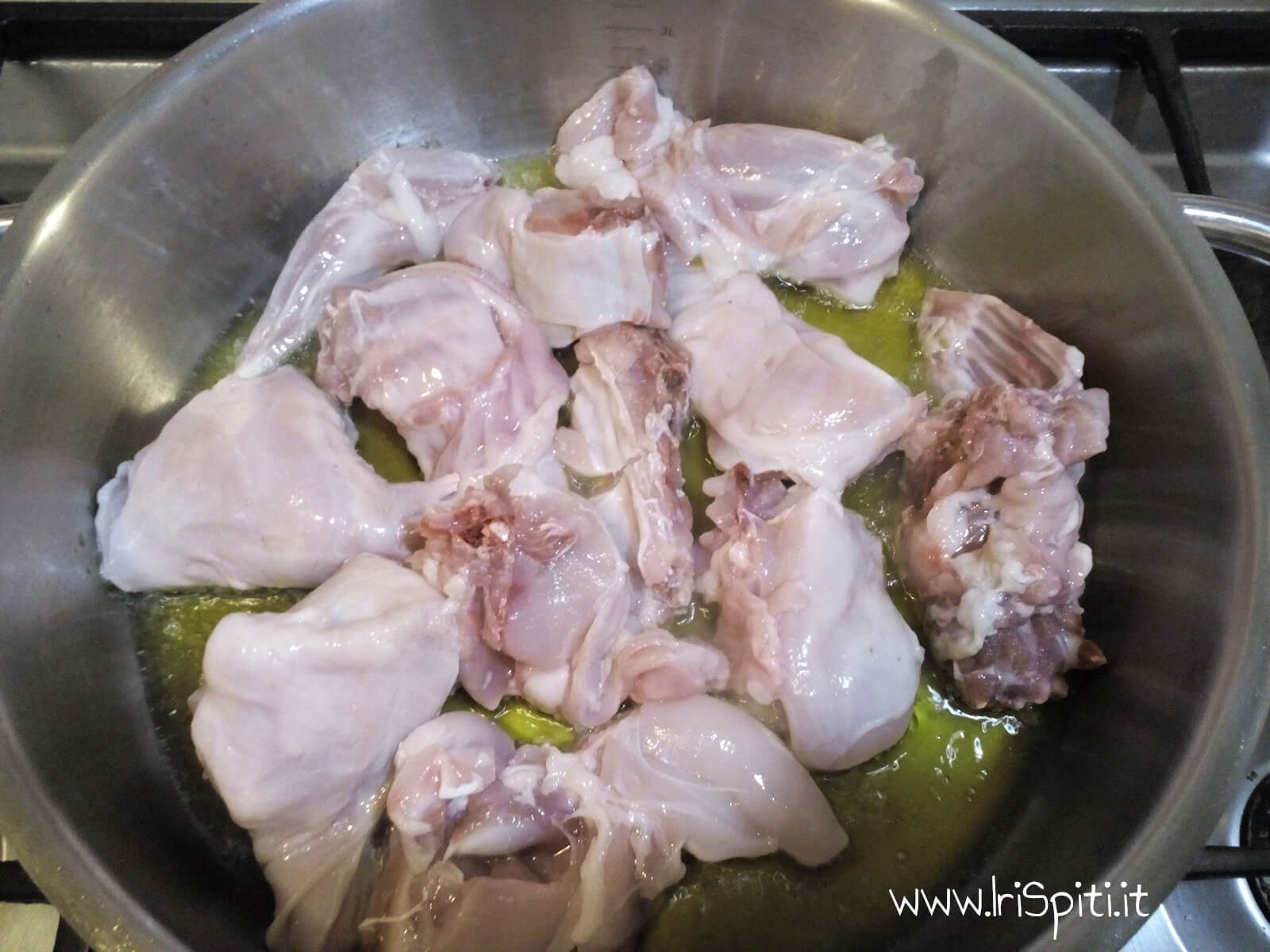 - In una casseruola larga e bassa mettiamo a scaldare l’olio e aggiungiamo i pezzi del coniglio.