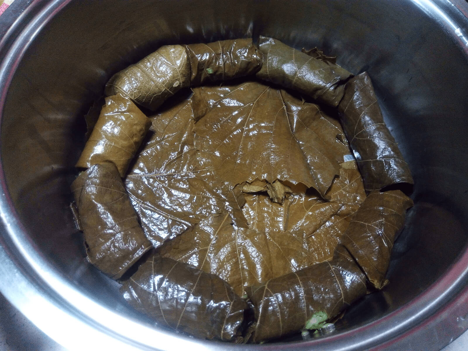 5. Una volta finiti gli strati, aggiungiamo prima i restanti 100 ml di olio e poi dell’acqua calda fino a coprire tutti i dolmades.