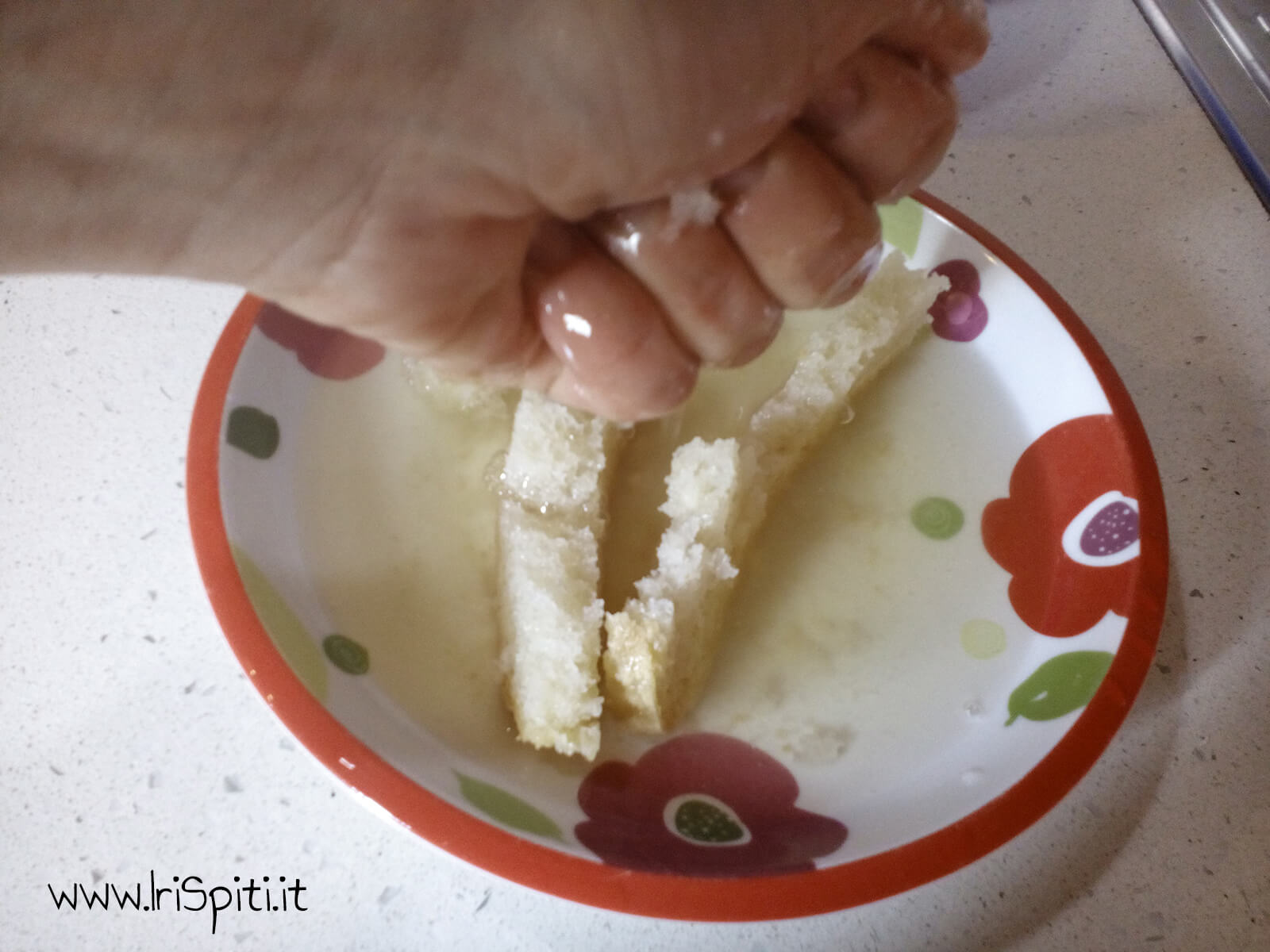- In un piatto cupo mettiamo le fette di pane a bagno con il vino e lasciamo per 10 minuti circa. Io ho usato il vino bianco perché sono allergica al vino rosso, ma devo dire che questo è decisamente più adatto.