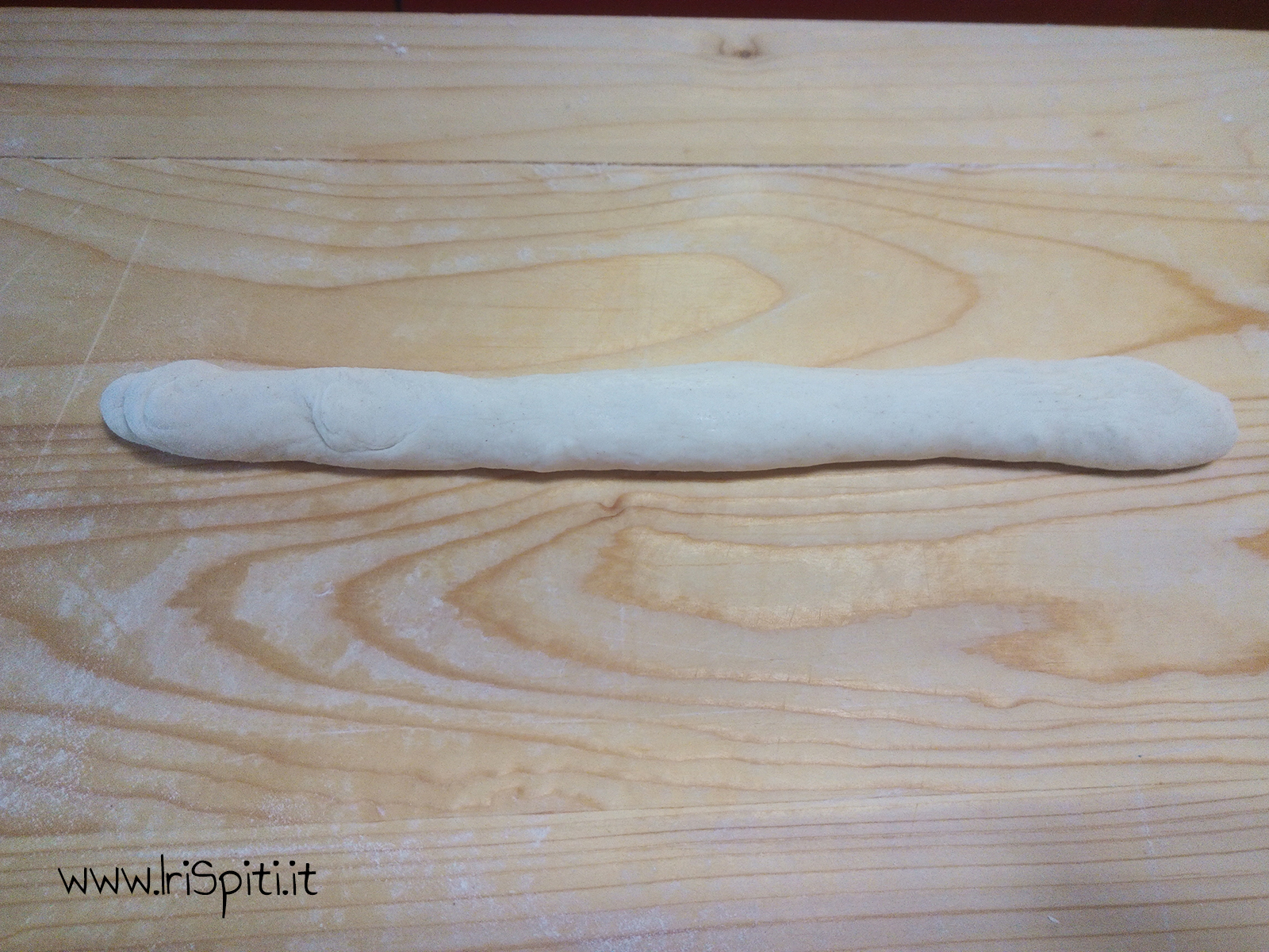- Prendiamo 80 gr di impasto, lo lavoriamo nelle mani e formiamo dei bastoncini di circa 20 cm che alla fine chiudiamo a forma di ciambella.