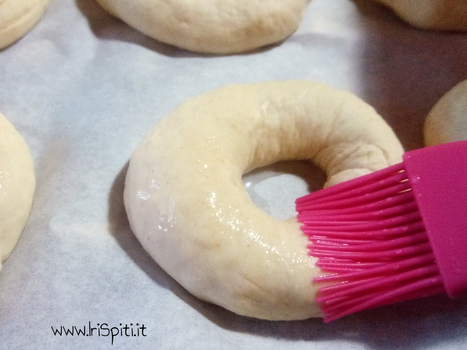 - Con un pennello bagniamo con acqua la superficie di tutti i koulouri per bene.