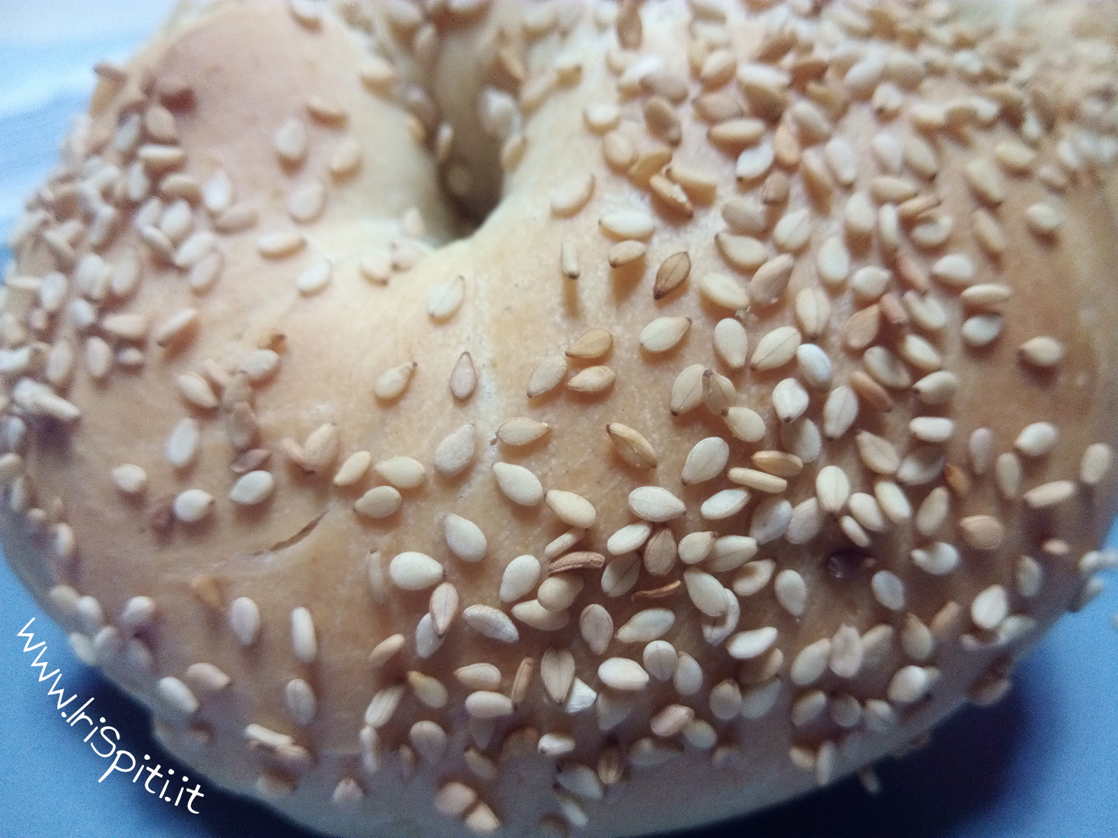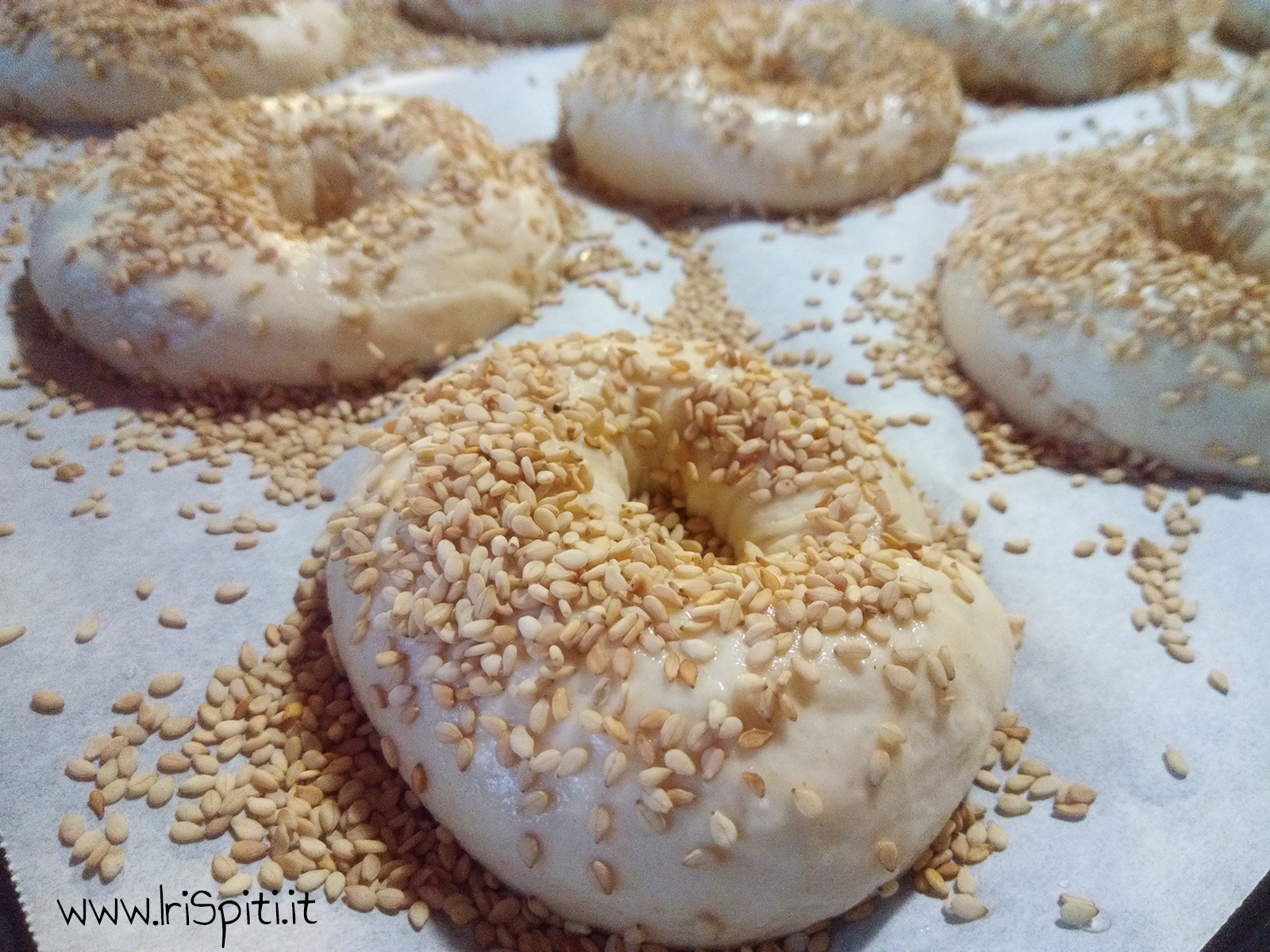 - A questo punto aggiungiamo con la mano il sesamo in modo che i semi coprano tutta la superficie delle ciambelle.