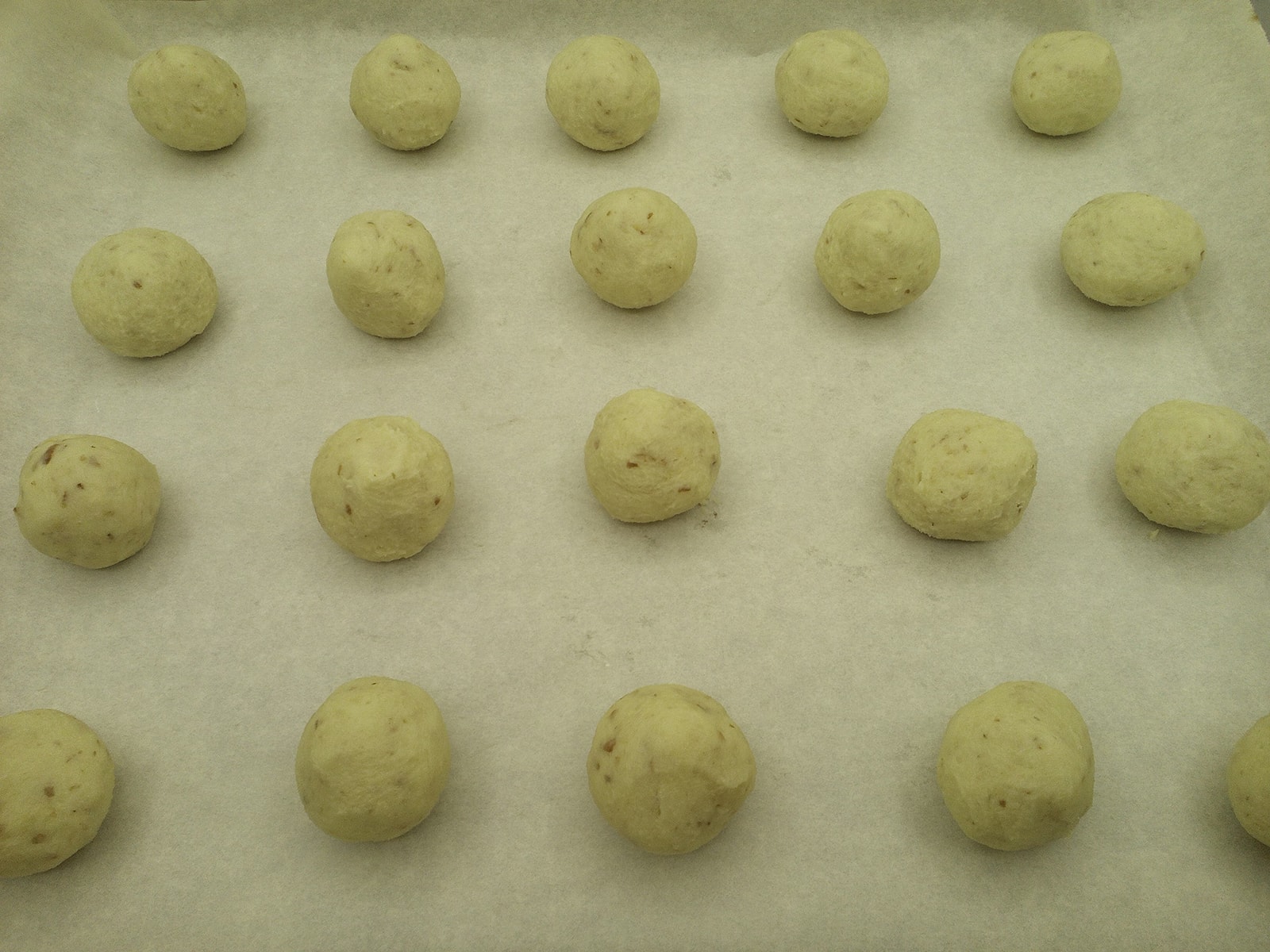 - Formiamo delle palline di 20 gr ognuna e appoggiamole su una teglia ricoperta don carta da forno.