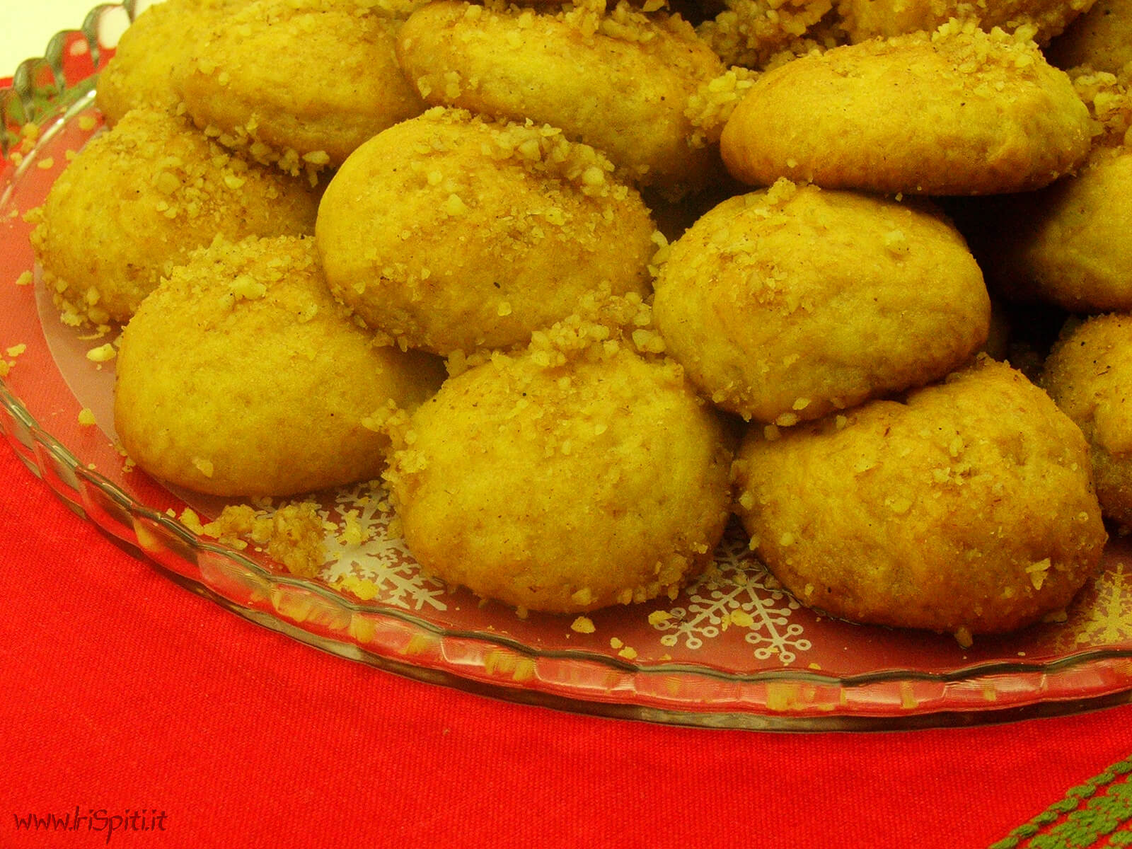 - Con l’aiuto di un cucchiaio sciroppiamo i biscotti direttamente sulla teglia avendo tolto prima la carta da forno e spargiamo sulla superficie le noci tritate, la cannella e il garofano. Lasciamo un’ora per assorbire bene.
