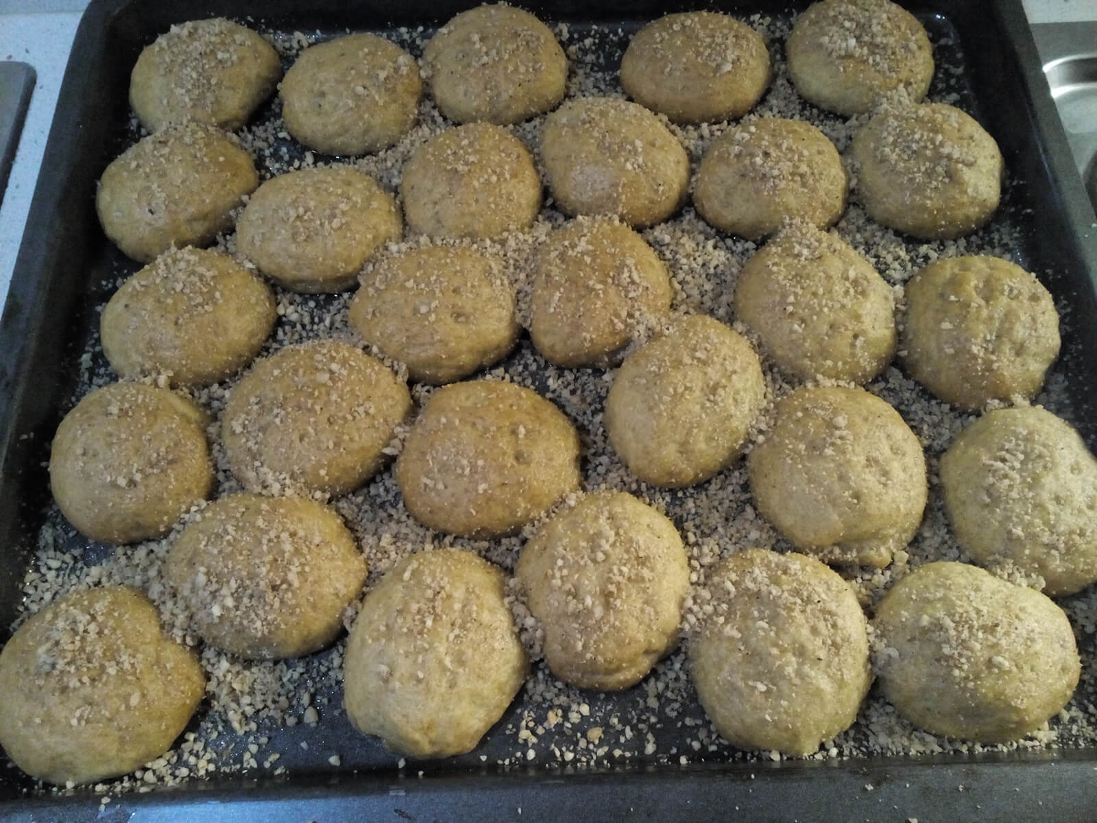 - Con l’aiuto di un cucchiaio sciroppiamo i biscotti direttamente sulla teglia avendo tolto prima la carta da forno e spargiamo sulla superficie le noci tritate, la cannella e il garofano. Lasciamo un’ora per assorbire bene.