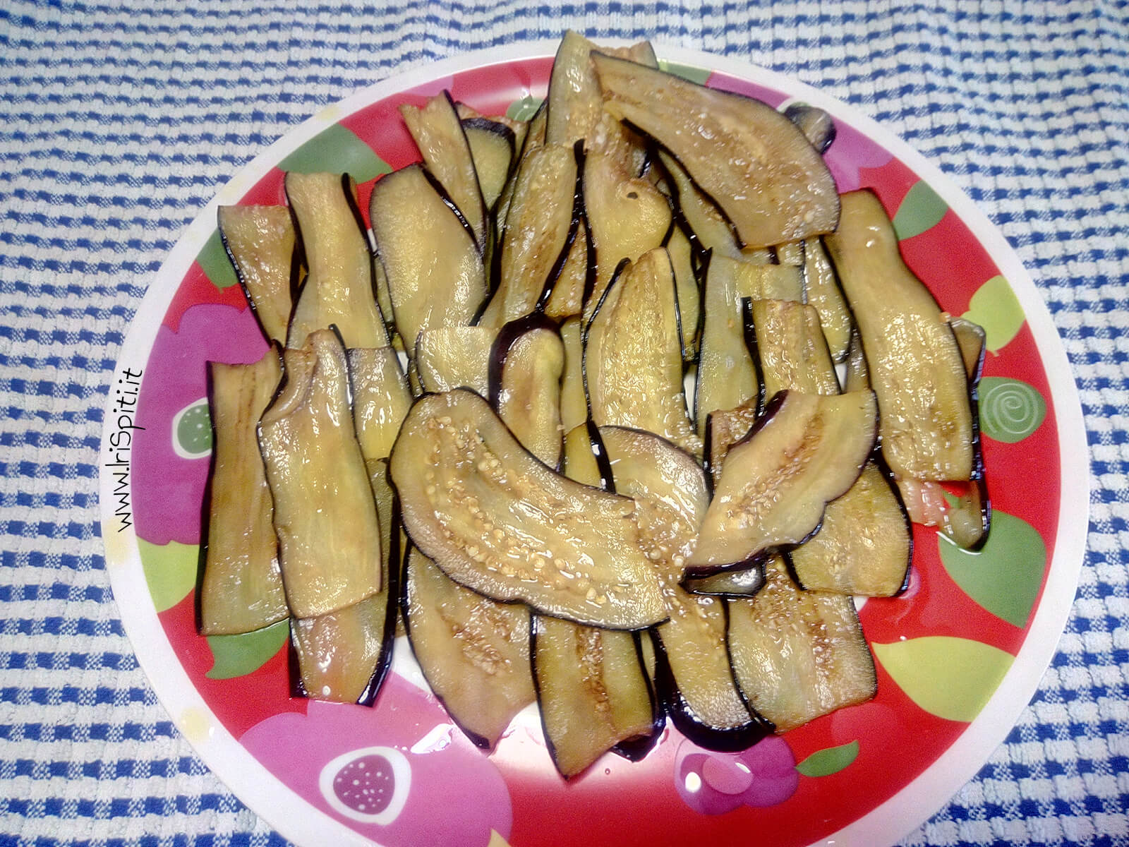 10. In una padella larga e bassa scaldiamo l’olio di semi e friggiamo le melanzane fino a diventare morbide ma non croccanti. Praticamente diamo una scottatura nell’olio caldo senza friggere a lungo. Finita la frittura le lasciamo raffreddare.