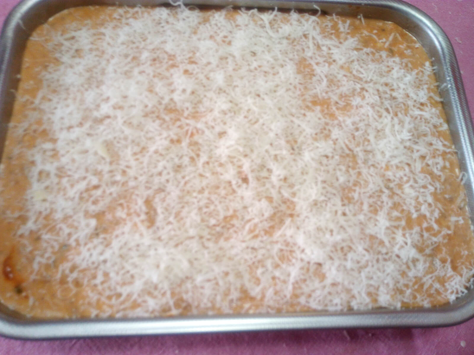 19. Copriamo bene la moussaka con la besciamella e il ragù e aggiungiamo il formaggio grattugiato.