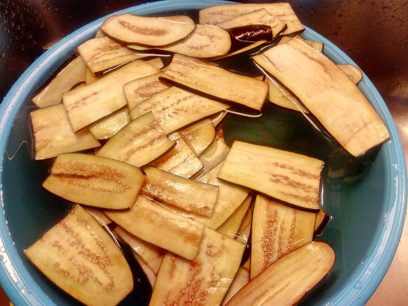 9. Passate le due ore, iniziamo a lavorare di nuovo le melanzane. Scoliamo l’acqua che è uscita dall’azione del sale, risciacquiamo una fetta per volta e strizziamo con le mani facendo uscire l’acqua in eccesso e l’amaro che questo ortaggio contiene. Asciughiamole bene con un panno per facilitare la frittura.