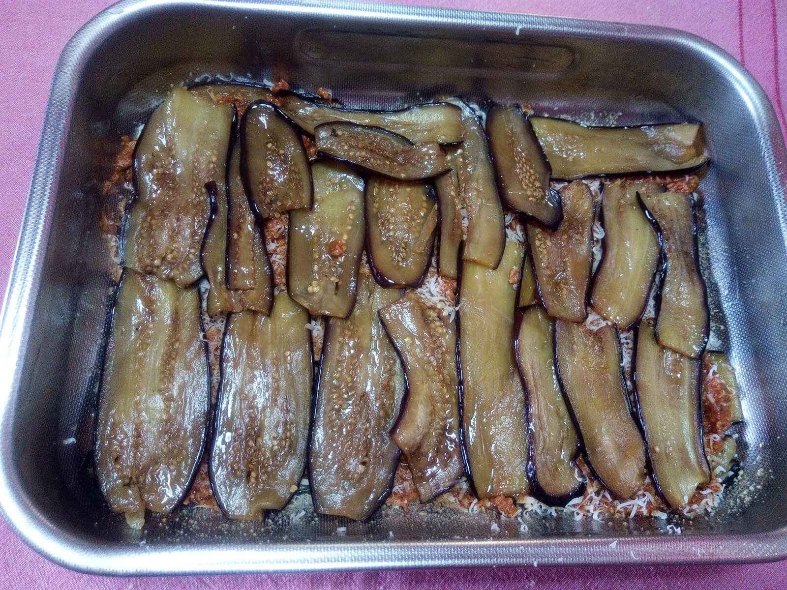 16. Creiamo il primo strato di melanzane mettendole in fila in un verso, orizzontale o verticale. Copriamo con il ragù e successivamente con il formaggio grattugiato.