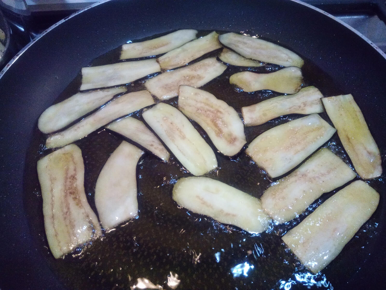 - In una padella larga e bassa scaldiamo l’olio di semi e friggiamo le melanzane fino a diventare morbide ma non croccanti. Praticamente diamo una scottatura nell’olio caldo senza friggere a lungo. Finita la frittura le lasciamo raffreddare.