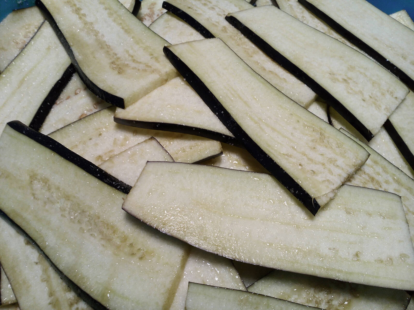 - Laviamo le melanzane e tagliamole prima a metà per lunghezza e dopo a strisce di circa mezzo centimetro di spessore. Ovviamente lo spessore lo decidete voi ma io per motivi anche di estetica le preferisco sottili per poter creare un moussaka più presentabile.