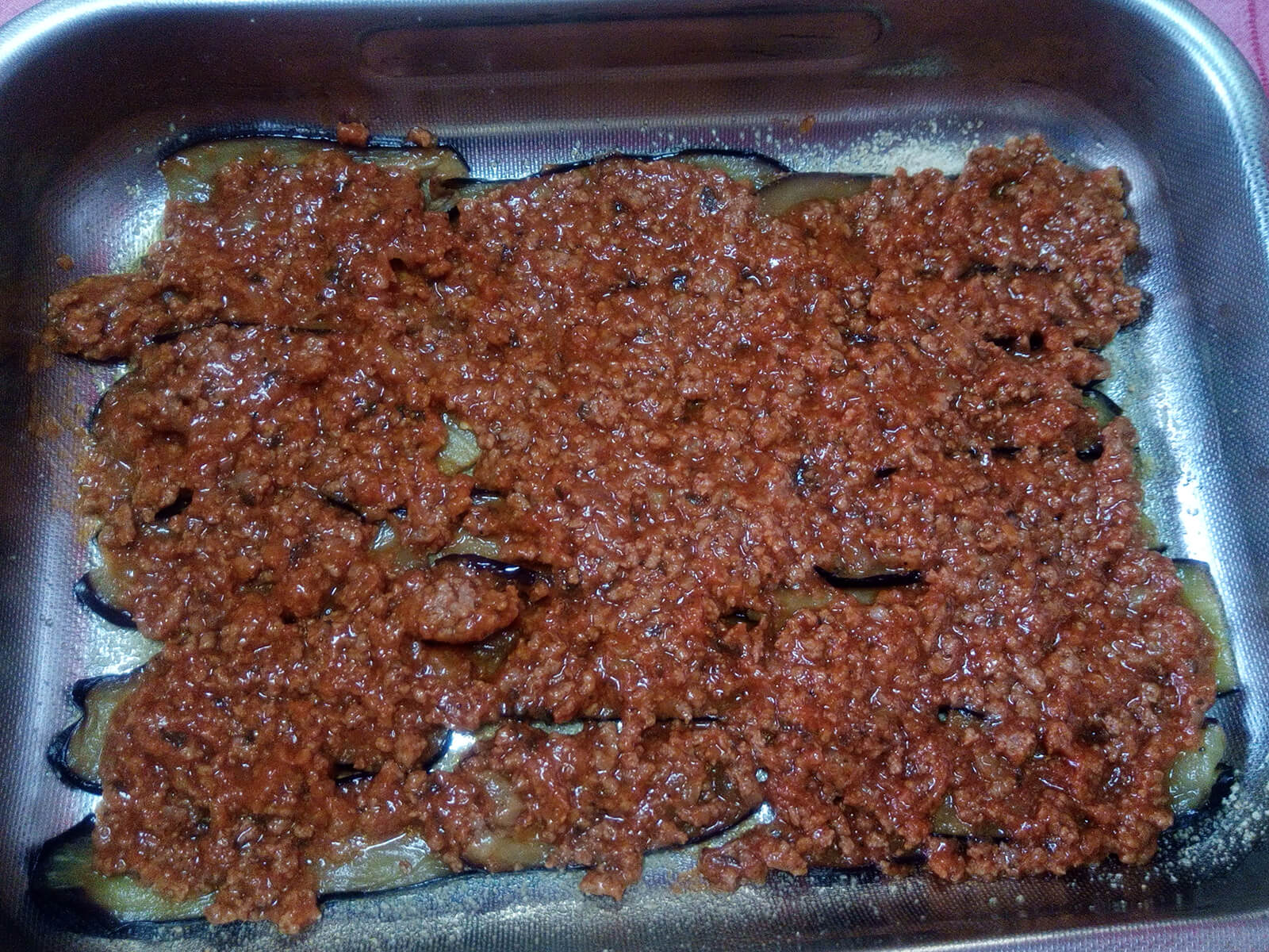 - Creiamo il primo strato di melanzane mettendole in fila in un verso, orizzontale o verticale. Copriamo con il ragù e successivamente con il formaggio grattugiato.