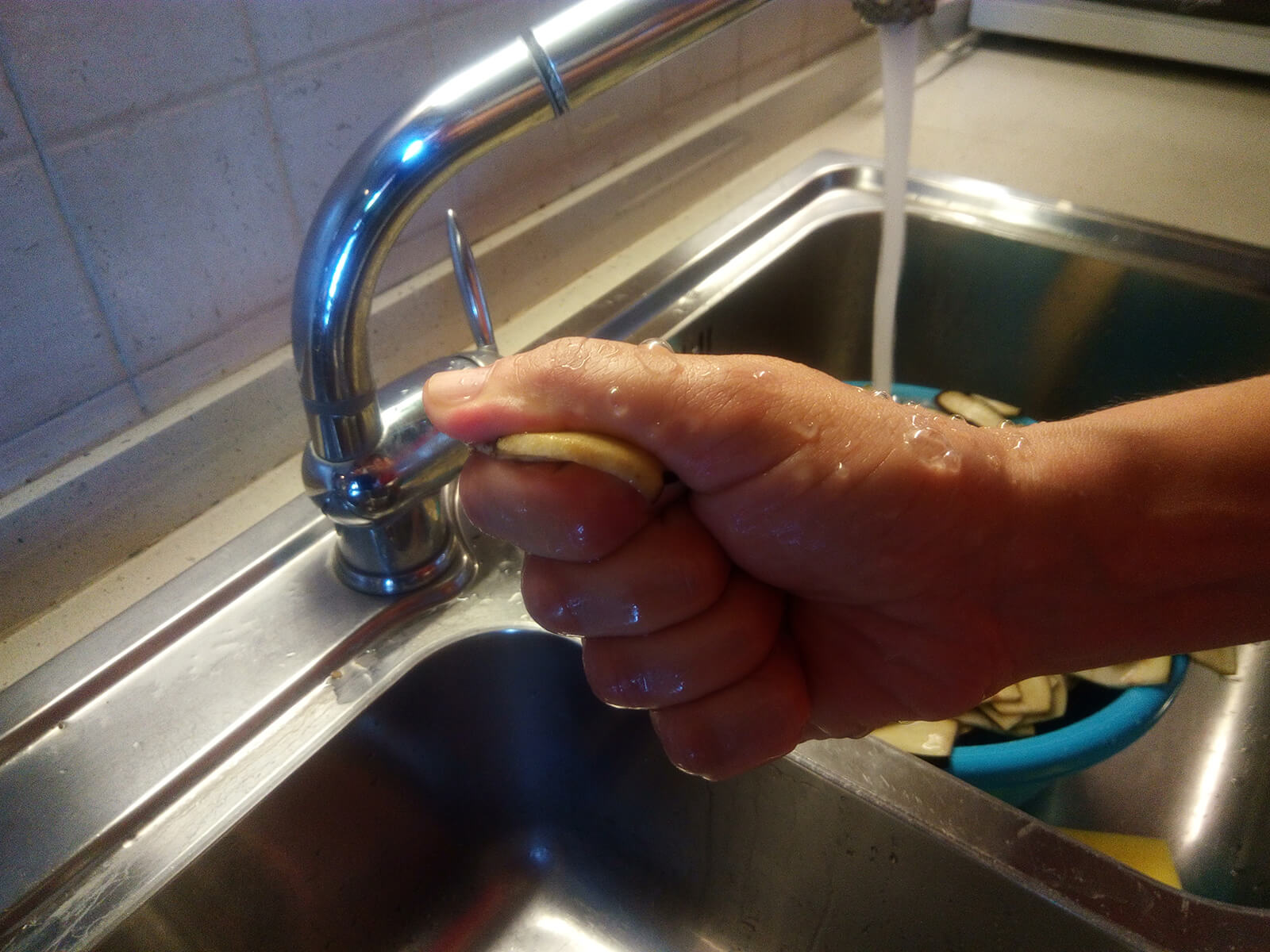 - Passate le due ore, iniziamo a lavorare di nuovo le melanzane. Scoliamo l’acqua che è uscita dall’azione del sale, risciacquiamo una fetta per volta e strizziamo con le mani facendo uscire l’acqua in eccesso e l’amaro che questo ortaggio contiene. Asciughiamole bene con un panno per facilitare la frittura.