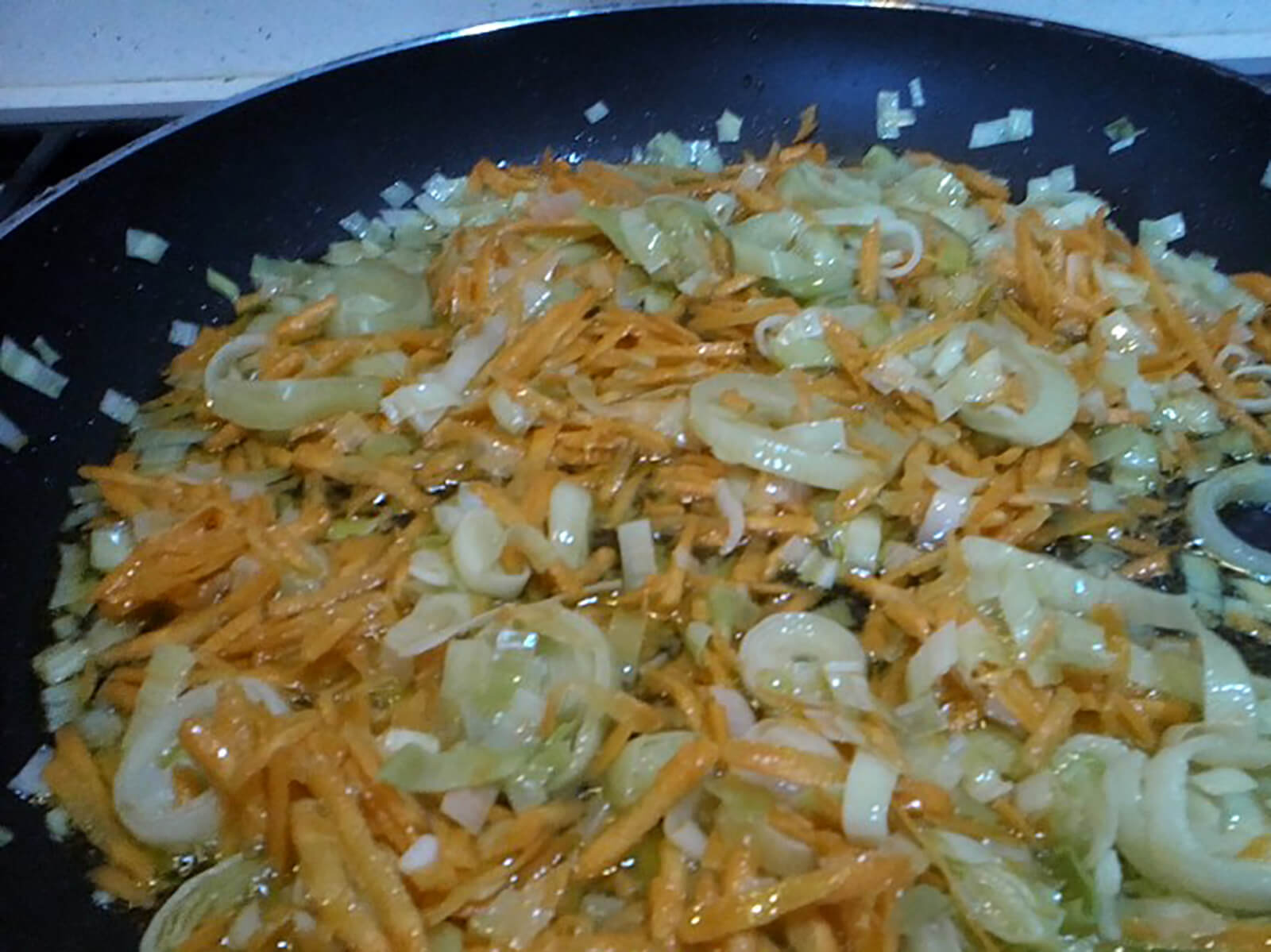 - In una padella scaldiamo l’olio di oliva e mettiamo a soffriggere i porri per 10 minuti circa.
