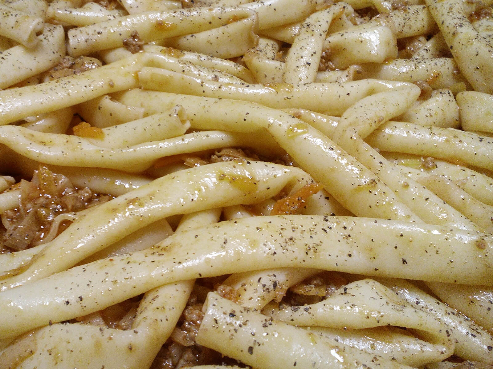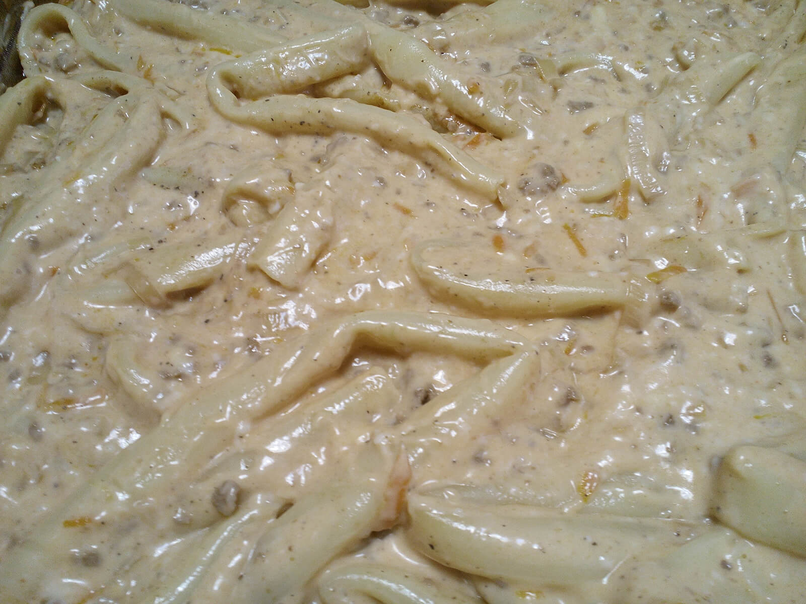 - Amalgamiamo il sugo restante con la besciamella e versiamo sulla pasta creando uno strato liscio.