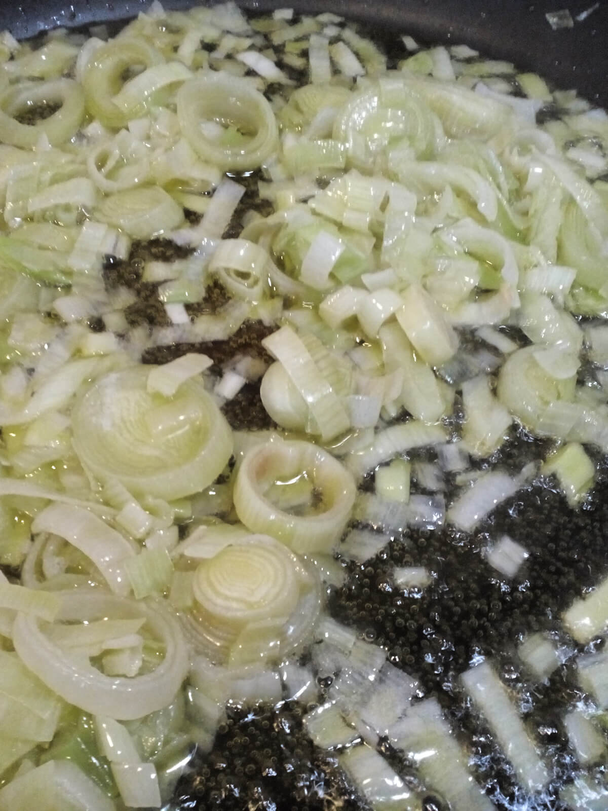 - In una padella scaldiamo l’olio di oliva e mettiamo a soffriggere i porri per 10 minuti circa.