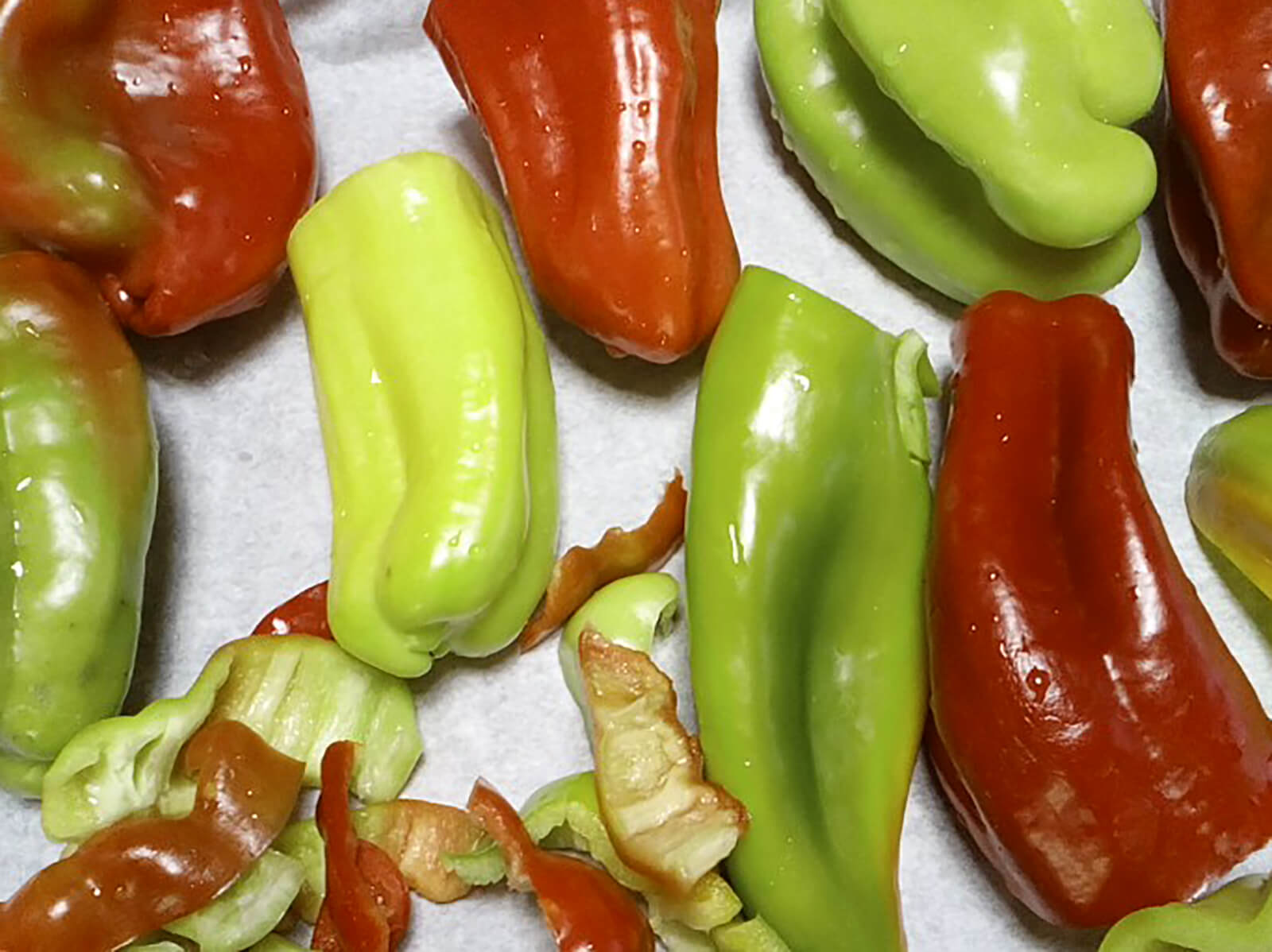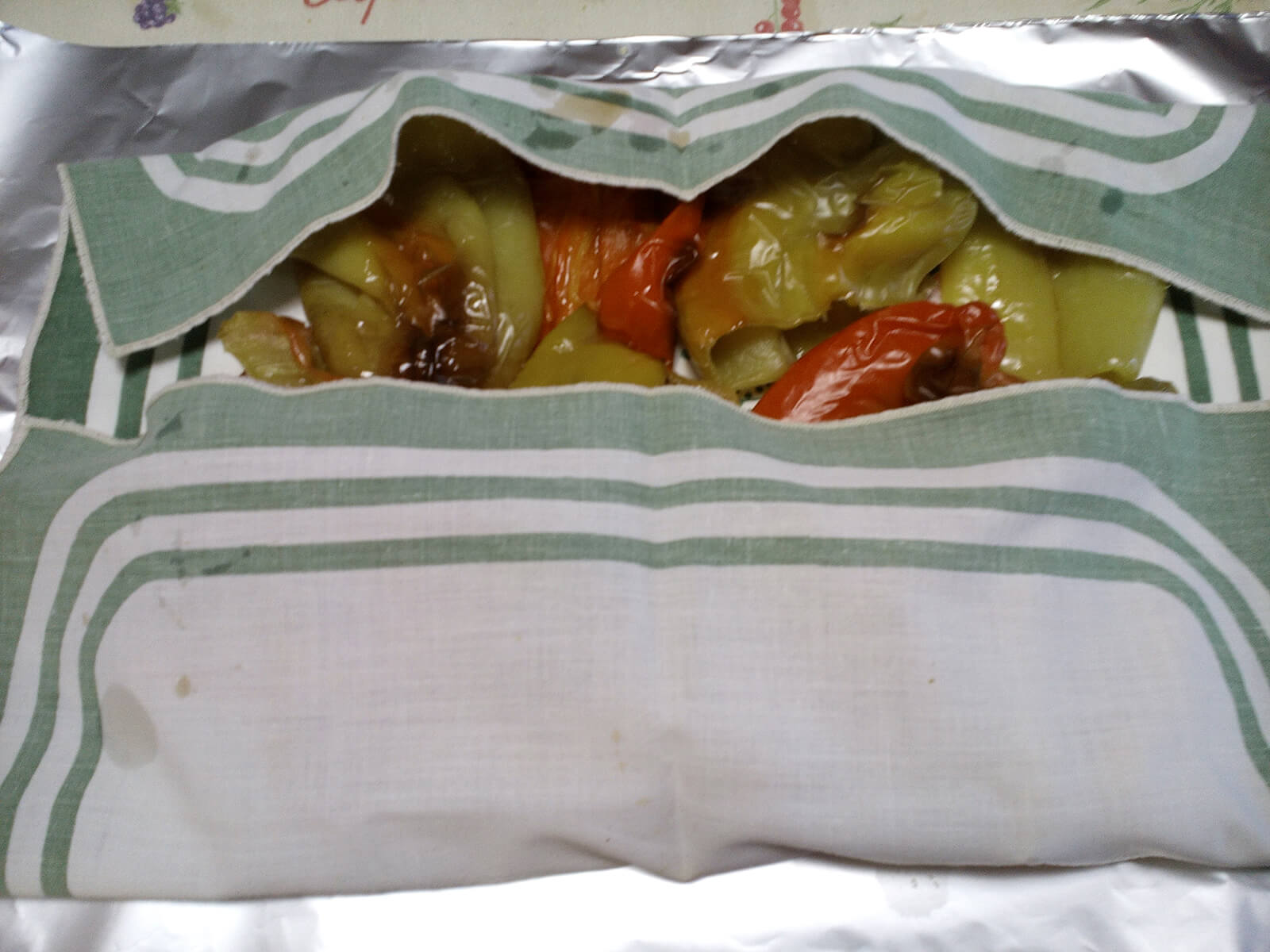 - Quando i peperoni sono cotti, li avvolgiamo in un canovaccio e successivamente in un foglio di alluminio. Aspettiamo circa mezz’ora fino a raffreddarsi completamente e apriamo il “rotolo”. Questa procedura serve a facilitare la spellatura dei peperoni.
