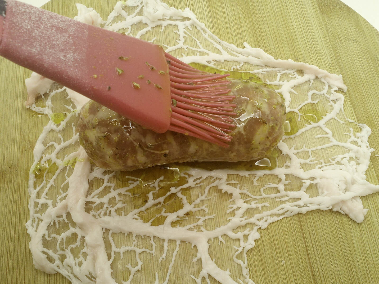 - Appoggiamo un pezzo di rete su un piano, provando ad aprirlo il più possibile. Mettiamo la salsiccia sopra e con l’aiuto di un pennello la copriamo bene con la salsa che abbiamo precedentemente preparato.