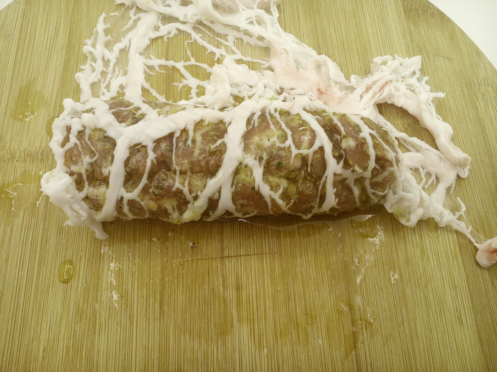 - Passato il tempo dell’ammollo, tagliamo la rete a pezzi grandi quanto la salsiccia per poterla coprire tutta.