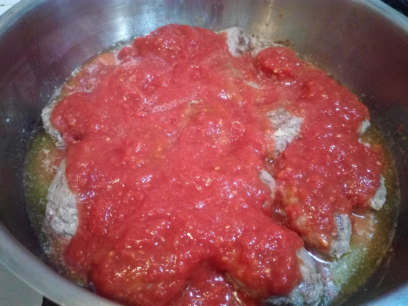 - A questo punto sfumiamo con il vino e aggiungiamo il pomodoro e nuovamente un po’ di sale e pepe per insaporire il nostro sugo. Se la vostra passata è leggermente agra, potete aggiungere un cucchiaino di zucchero. Chiudiamo con il coperchio e lasciamo cuocere per circa 30 minuti, controllando ogni tanto che non si asciughino o non si attacchino.
