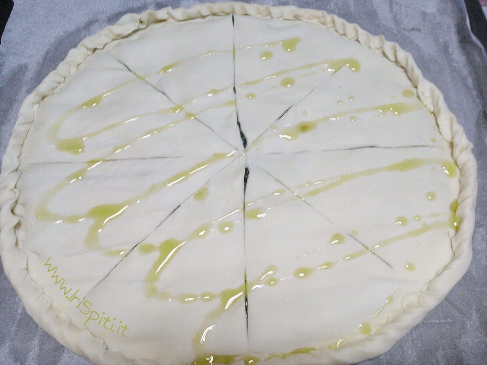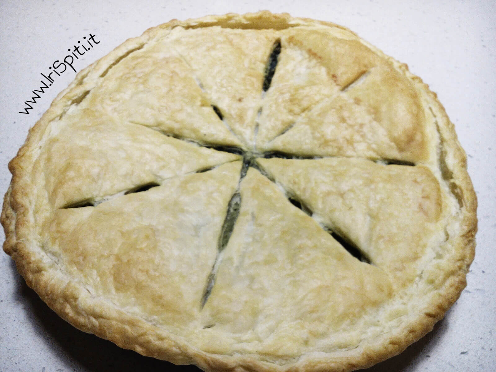 - Posizioniamo sopra l’altro disco di pasta sfoglia a coperchio e chiudiamo bene creando in orlo con le dita a modo che non esca la farcitura durante la cottura.