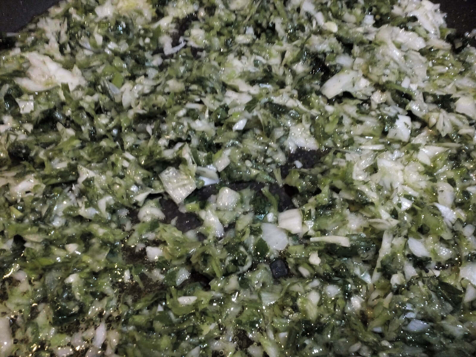 - In una padella mettiamo un filo d’olio a scaldare e aggiungiamo la cipolla, l’erba cipollina, il porro, il prezzemolo e l’aneto. Facciamo appassire le verdure a fuoco basso per solo 5-10 minuti.