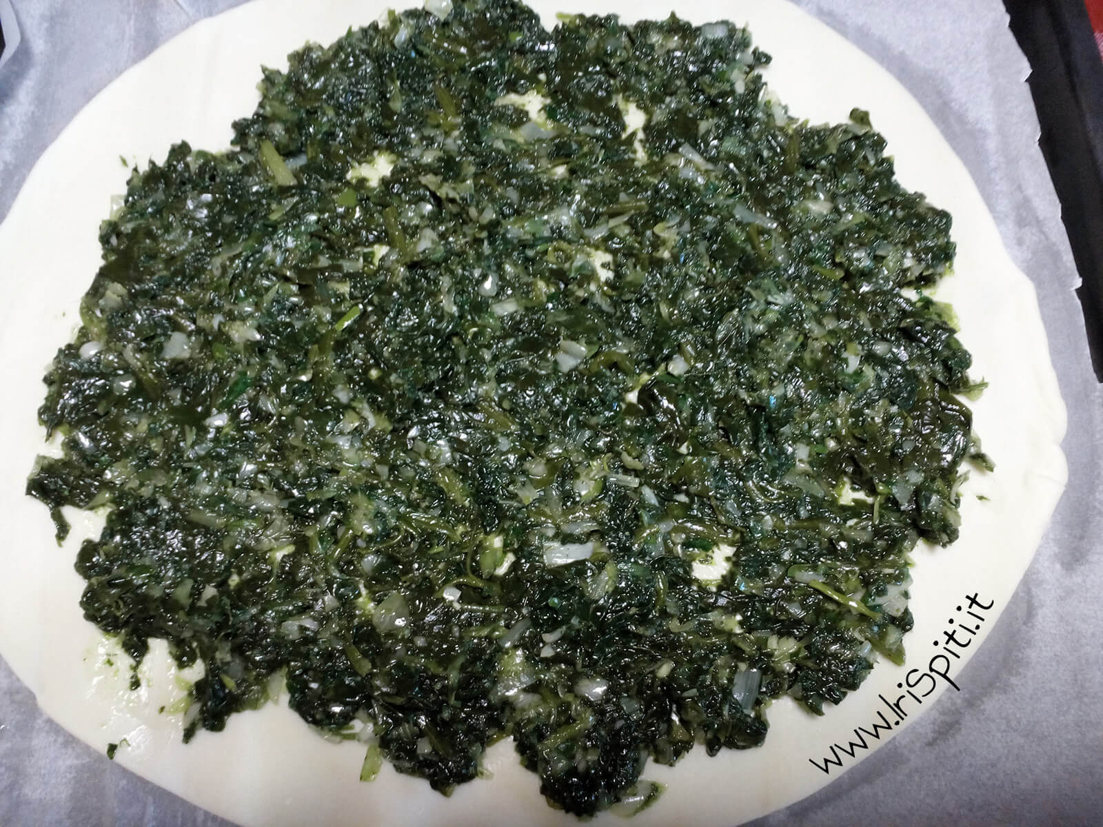 - In una teglia ricoperta con la carta da forno mettiamo un disco di pasta sfoglia e aggiungiamo la farcitura di spinaci, stesa bene in modo uniforme, lasciando circa 2 cm liberi tra i bordi. A questo punto aggiungiamo il sale e il pepe.