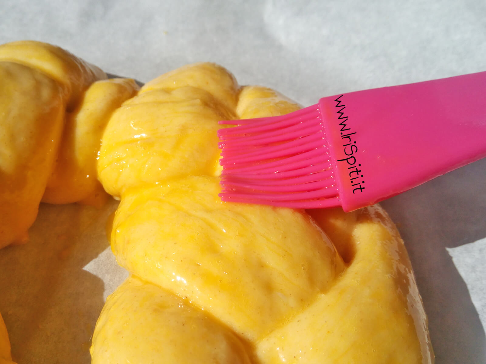 - Spalmiamo l’uovo sbattuto sopra la superficie del tsoureki, ricopriamo con il sesamo e cuociamo in forno riscaldato e statico a 160º per i primi 10 minuti e a 140º per altri 30 minuti.
