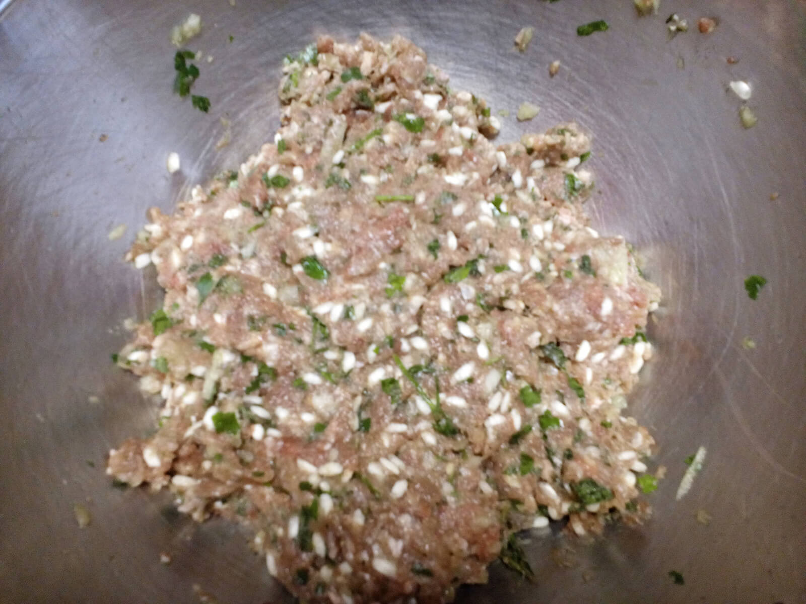 - In una ciotola mischiamo bene la carne macinata, la cipolla tritata, il riso, la menta, il prezzemolo, il sale, il pepe e un po’ di olio di oliva.